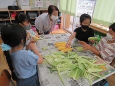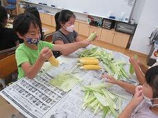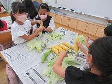 1時間目から3年生の教室では、トウモロコシの皮むきをしています。皮むきの時にヒゲがでてきますが、ヒゲの数はトウモロコシの実と同じなのですね。そんなお話を聞きながらむいていきます。