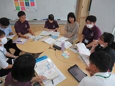 今日は子どもたちを早帰りさせての研究日。他校からも1名の先生が学びたいと参加してくれ、4教科に分かれて、2学期から取り組む授業について話し合いをしました。どの教科も、子供たちが自ら学びたいと思い、取り組んでいける授業づくりを目指して、活発な話し合いが進み、講師で招いている5人の先生たちを中心に、授業のイメージがしっかりと膨らんでいきました。