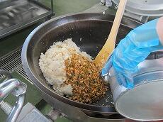ガーリックピラフは、ご飯と具材を釜の中でしっかりと混ぜながら、仕上げていきます。