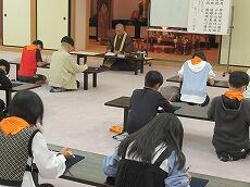 日光彫を終えて輪王寺に移り、輪王寺のお堂の二階で写経体験です。輪王寺の庭のもみじが色鮮やかな紅葉になっています。