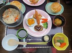 7時から夕食が始まりました。メニューは、釜めし、栃木名物干ぴょうの味噌汁、湯葉と野菜の煮物、パイ包みクリームシチュー、エビフライ、ハンバーグ、フライドポテト、ニンジン、ブロッコリー、ミカン、チョコレートムーズです。
