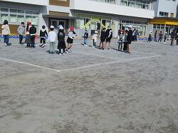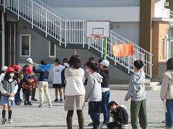 業間休みになると、それぞれの集合場所に集まってきます。班の旗を振って集める姿も5年生。
