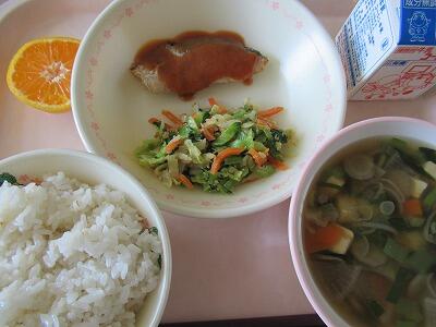今日は和食献立で、メインはメルルーサのゆず味噌かけである。メルルーサという魚の名前は馴染みではないが、一般的な白身魚のフライやフィッシュバーガーに使われているポピュラーな食材である。南半球で多くとれる魚らしい。その切り身に柚子味噌がかけられて、白いご飯によく合う美味しい魚料理である。そこにチンゲン菜のごま和えである。よく食事となる小松菜と姿形はよく似ているが、原産地が日本と地中海沿岸と違う。今日はごま和えで人参やキャベツと一緒に美味しくシャキシャキといただける。けんちん汁は、澄んだ汁にゴボウや大根のうまみとネギの香りがついて、美味しいお汁である。少し大人の味であるが、日本の根菜を美味しく食べて欲しいお汁である。みかん(温州ミカン)は今季初物である。甘みもしっかりとして、美味しいみかんであった。