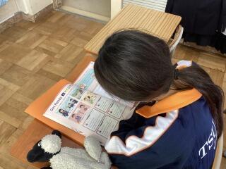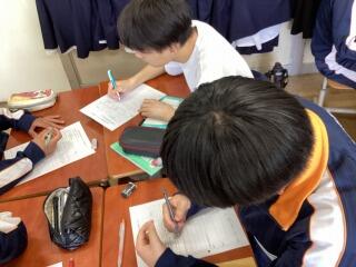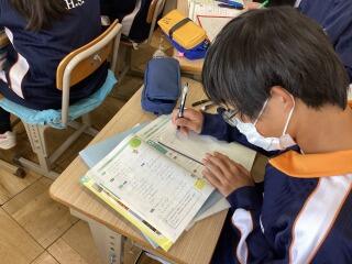 一年英語、英文を書く練習です。部活動の入部届を英語で書いていました。自分のやりたいことや好きなことをよく書けていました。