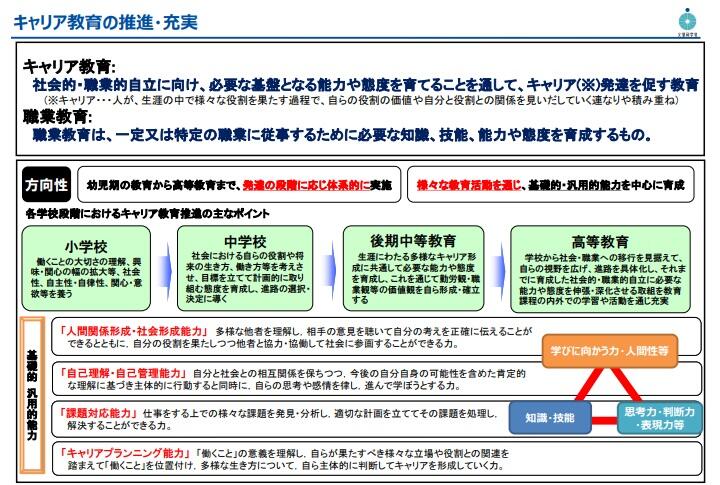 〇注意すべき点は、キャリア教育は「生き方」を育む広い概念で、その一部として職業教育があるということです。後者は「専門技術」を学んでスキルをアップするなどより実践的な能力育成に特化しているものです。職人を育てるのは職業教育ですが、キャリア教育は社会的・職業的自立に向けた「汎用的な力」を養うのがその主目的です。