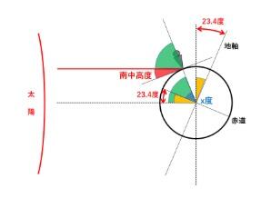 〇明日は「春分の日」で、一般的には「秋分の日」と同じく、昼と夜の時間がほぼ同じになる日です。ただもう一つ、その日の太陽の南中高度(太陽が真南【子午線】を通過する瞬間、地平線から最も高く昇った時の角度)の求め方が数学的にわかりやすいのです。