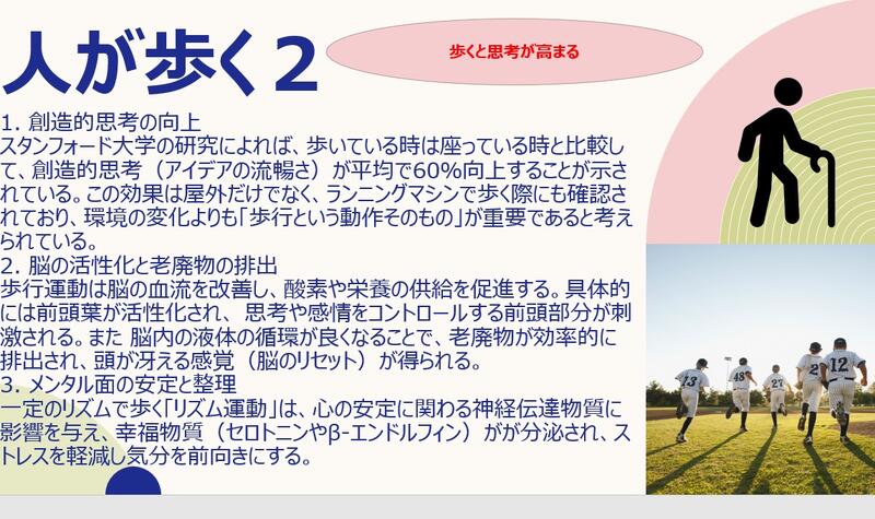 「25年間のアスリート人生にピリオドを打ったのは、12年前。カラダを鈍らせないため、引退後はジムに通ったりランニングしたり。でも筋トレは性に合わず、ランでは現役時代に酷使した膝に痛みが生じがちでした。それで7.8年前くらいから歩き始めました。歩いているだけで思ったより太らないし楽しい。だったら歩きでいいかなと。ランとウォークでは体感的にエネルギー消費量gは数倍違うような感じがしますが、実際には30分走るのと1時間歩くのとではそんなに違わないんです。(略)現在のところ、一日の目標歩数は1万2千歩程度。都内なら目的地の2.3駅前で降り、散歩感覚で歩く。(略)僕は油断すると『そもそも○○とは何か?』と考えてしまうんです。その考えを巡らせている間はほとんど歩いています。歩いていると思考がどんどん深くなっていきますね。電車の中での移動中に本を読んで、そのまま電車を降りて歩きながら自分の頭で考えて、たどり着いたカフェで何かを書き始めるときれいなコンポ(組合せ)になります。思うに、脳内の接続みたいなものは脳の活動だけではつくりだすのは難しいんじゃないかと。基本的に人間は狩猟採集活動をすることで脳の接続を進化させてきました。だから身体活動で血流がよくなって異なる接続パターンが生まれたときに、ひらめきが得られると思うんです。