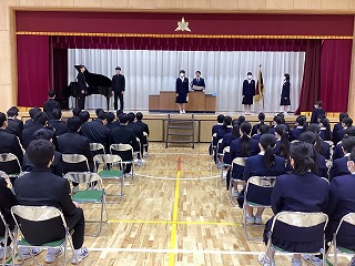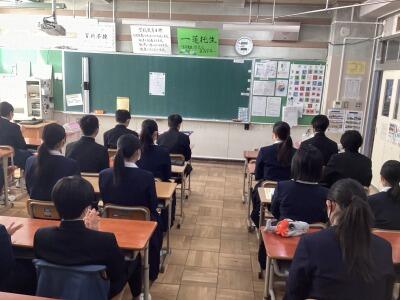 1時間目に1年生の学年末最後の学年集会が行われました。この1年間の学校生活を振り返り、来年度への決意を新たにする大切な時間となりました。