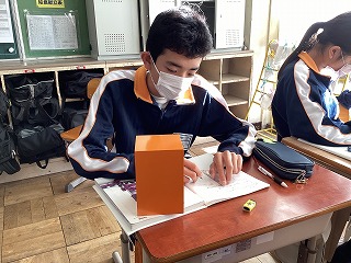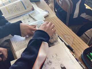 1年数学 投影図を書いてみる授業です。模型を見て触りながらまとめています。