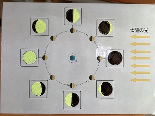 3年理科 地球から見た月はどのように見えるのか、色を塗りながら確認しています。