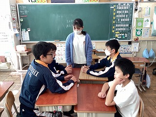 3組、澤井先生です。数学でマイナスがついたかけ算について、話し合っていました。
