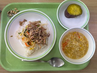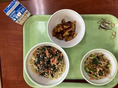 濃厚なビビンバ、さっぱりしたスープ、そして素朴なふかしいもがバランスよく組み合わさり、満足感の高い給食でした。