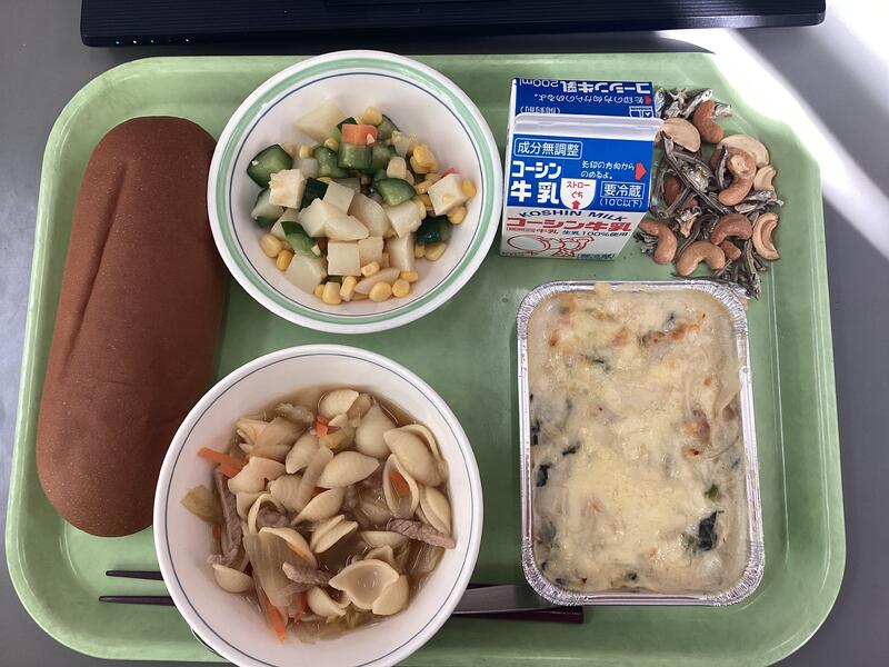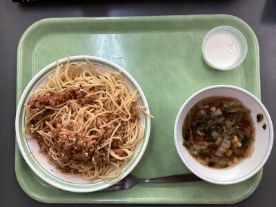 大豆入りミートスパゲティはトマトの酸味とひき肉の旨味が絶妙に絡み合った、コクのあるソースが特徴。大豆が加わることで食感にアクセントが生まれ、噛むたびにほのかな甘みが広がります。麺によく絡むソースの濃厚な味わいが、最後の給食にふさわしい満足感を与えてくれました。
