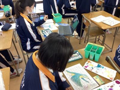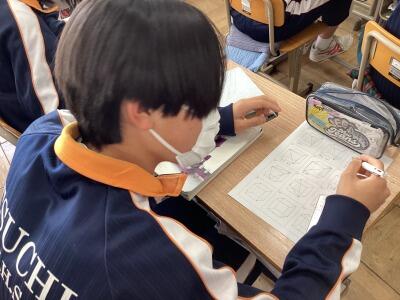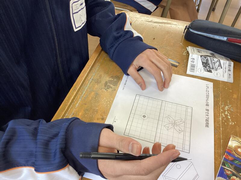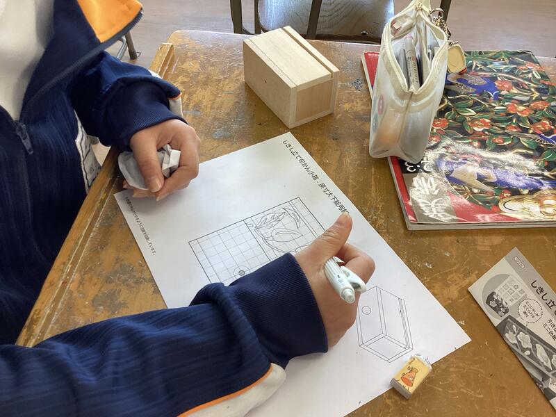 3年美術、印鑑を収納する小箱のデザインです。和風の柄を思い思いに描きました。
