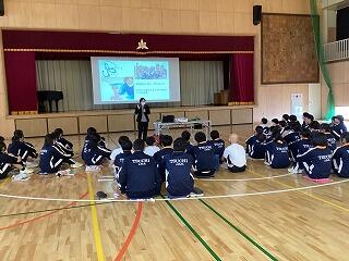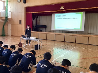 保護者会では、まず校長がこの1年間の学校生活の振り返りや生徒たちの成長について話しました。続いて、生徒指導主任から春休みの過ごし方についての注意点、進路指導主任からは今年度の進路状況についての報告がありました。