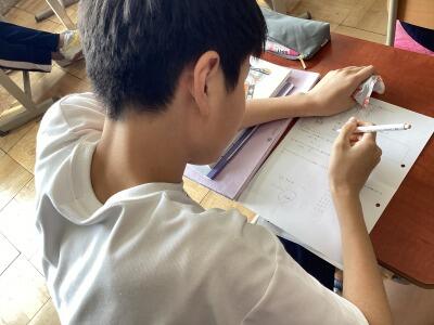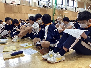 2年数学 今年度の高校入試問題に挑戦中。いよいよ最上級生になります。その自覚が芽生えたでしょうか。