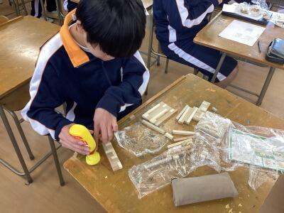 二年美術、三種類の木を用いて入れ物を作ります。