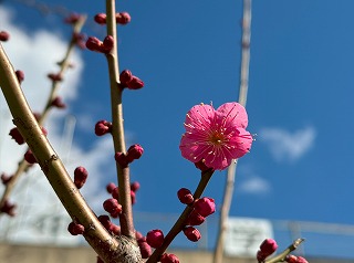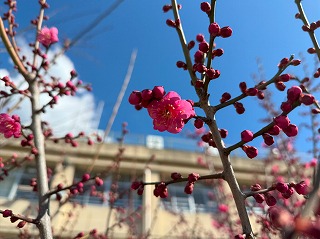 校舎裏にある河津桜が、鮮やかなピンク色の花を咲かせています。早咲の桜として知られる河津桜は、春の訪れを一足早く感じさせてくれます。桜の木には鳥たちも集まり、枝にとまって一休みする姿が見られました。花の蜜を味わっているのか、さえずりながら楽しそうに飛び回る様子は、まるで鳥たちもお花見をしているようです。