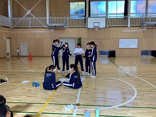 一年体育、バレーボールの練習です。班でパス回しの練習をしていました。