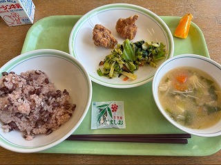 今日の給食は、特別感のある赤飯が主役の和の味わいが広がる献立です。