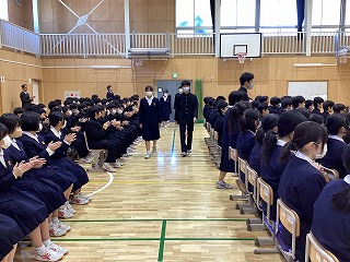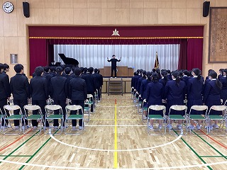 本日卒業式の予行練習が行われ、生徒たちは本番に向けて入退場や礼の動作を確認しました。緊張した面持ちの中、厳かな雰囲気で進行し、卒業への実感を深めました。