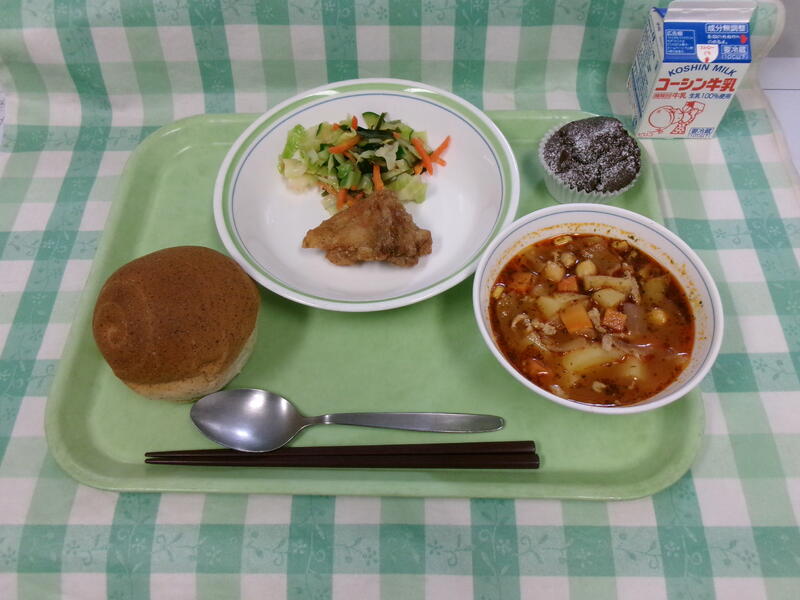 本日のメニュー:胚芽パン、フライドチキン、海藻サラダ、ミネストローネ、米粉のココアケーキ。牛乳