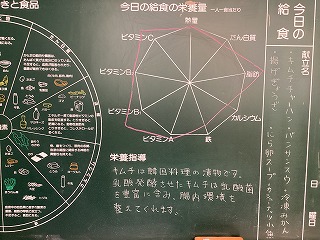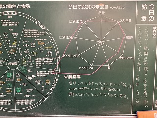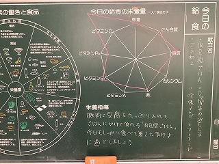 各学年の栄養黒板に貼ってある、事務室の先生の書き下ろしポスターです。