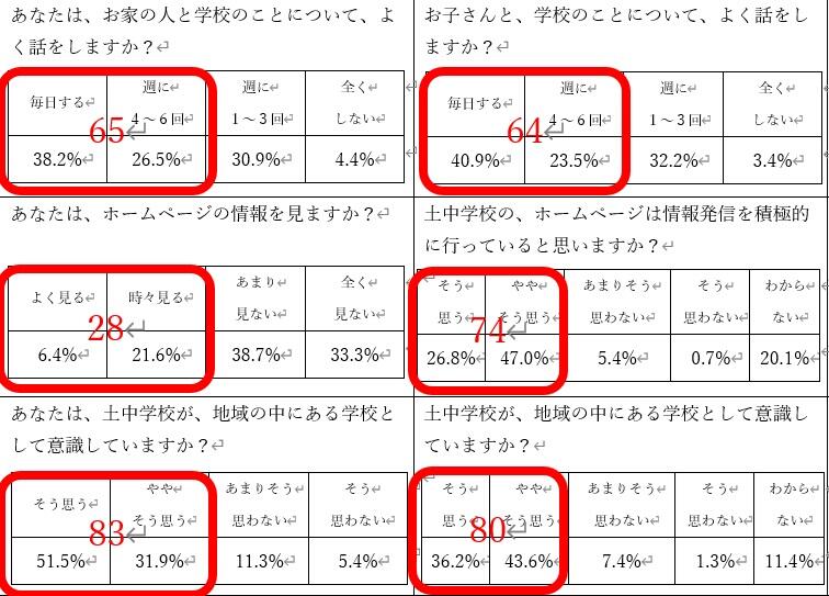 〇一昨日に引き続き、次の3項目は、学校を支えてくれる家庭や地域との関連項目です。私としてはホームページ及びこのブログは、家庭や地域の方々に向けて発信してきましたが、生徒たちにももっと閲覧してもらう手立てを講じて、特に社会と学校のつながりなども知ってもらいたいと思いました。