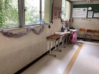 1年生フロアの廊下です。ハロウィン仕様から一転、クリスマスの装いです。