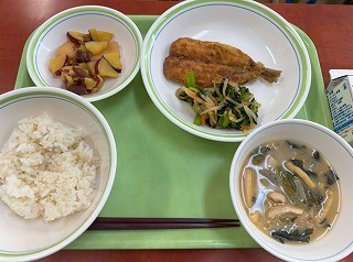 今日の給食は和の味わいを楽しめるメニューでした。ご飯はいつも通りふっくらとした仕上がりで、メインのイワシのカレー揚げとの相性が抜群。イワシは外がカリっと揚がっていて、ほんのりカレーの風味が加わり、香ばしくたべごたえがありました。