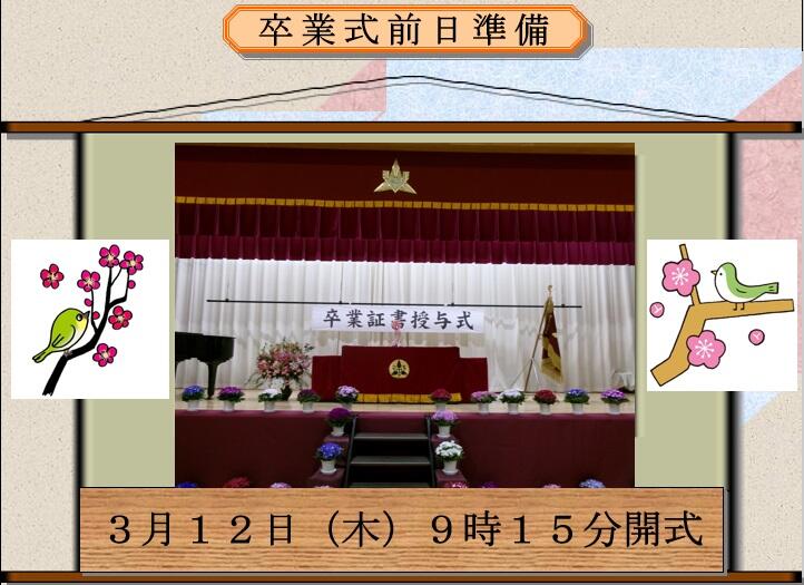 〇卒業式の朝を迎えました。朝は曇っていますが、雨は何とか降らずにすみそうなので安心しています。昨日の卒業生の最終練習の「群青」を聴かせてもらい、感動しました。その成長ぶりを目の当たりにしましたので、昨晩はいろいろと思い出がよみがえり、寝つきが悪く、今朝も3時に目が覚めてしまいました。