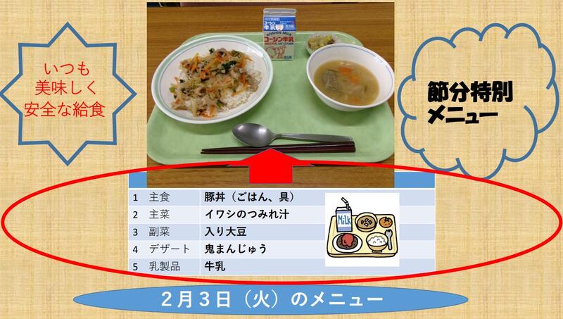 〇今日の給食メニューは、節分にちなんで、「豚丼、鰯(いわし)のつみれ汁、鬼まんじゅう、入り大豆、牛乳」です。昔は家庭でも鰯の頭を焼いて柊の枝で刺した「柊鰯(ひいらぎいわし)」を家の玄関などに飾る風習があった記憶があります。