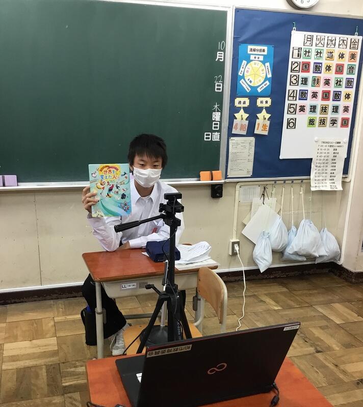土中学校からは1年生岡田くんと2年生藤山さんが参加し、オンラインで「おすすめ本」を市内の中学生と紹介し合いました。