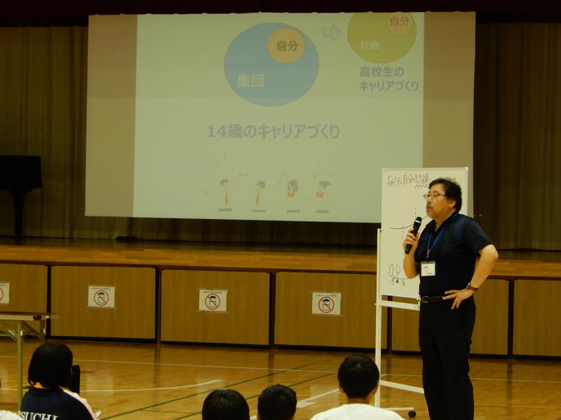 〇講師が参考として、学年職員一人ひとりのキャリアデザインについてインタビューしてくださり、生徒たちはそれに真剣な表情で耳を傾けていました。