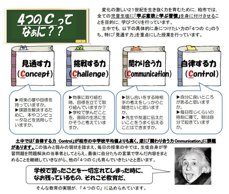 〇柏市は「第2次柏市教育振興画(~令和7年度)」の中で、この変化の激しい時代を生きていく生徒に、最低限身に付けて欲しい力を設定しています。それを4つの力(コンセプト、チャレンジ、コミュニケーション、コントロール)を「4つのC」と銘打っています。先ほどのアインシュタインの言葉のような教育の実現が、「4C」に込められています。