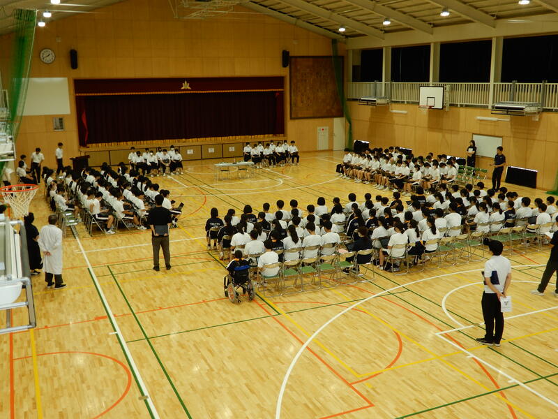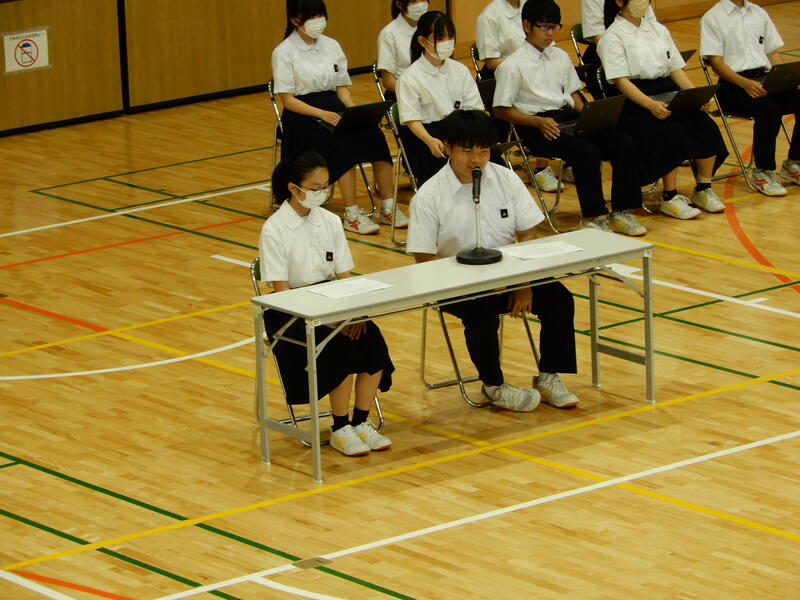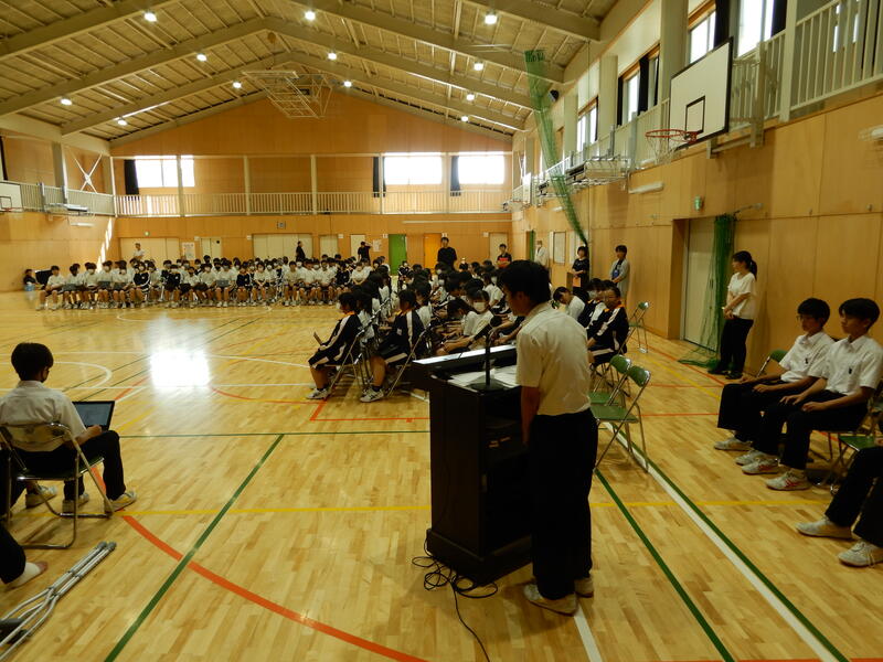 〇昨日は生徒総会を実施しました。外は猛暑でしたが、午後の体育館内は空調のお陰で快適でした。ここまで今年度の生徒総会に向けて、生徒会総務が作成した議案書を各クラスで「学級討議」してきました。生徒総会では各クラスからの賛成・反対、質問・修正案などを集約し、最後に全生徒から拍手による承認を得ました。