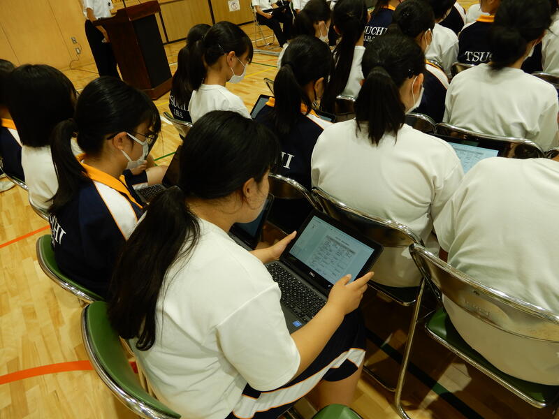 〇議長として3年生の工藤さんと森さんが選ばれ、生徒たちは手元のタブレット型端末で議案書を見ながら参加しました。議案書の内容は次のようになっています。