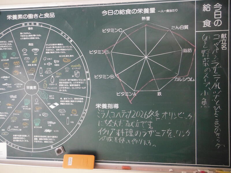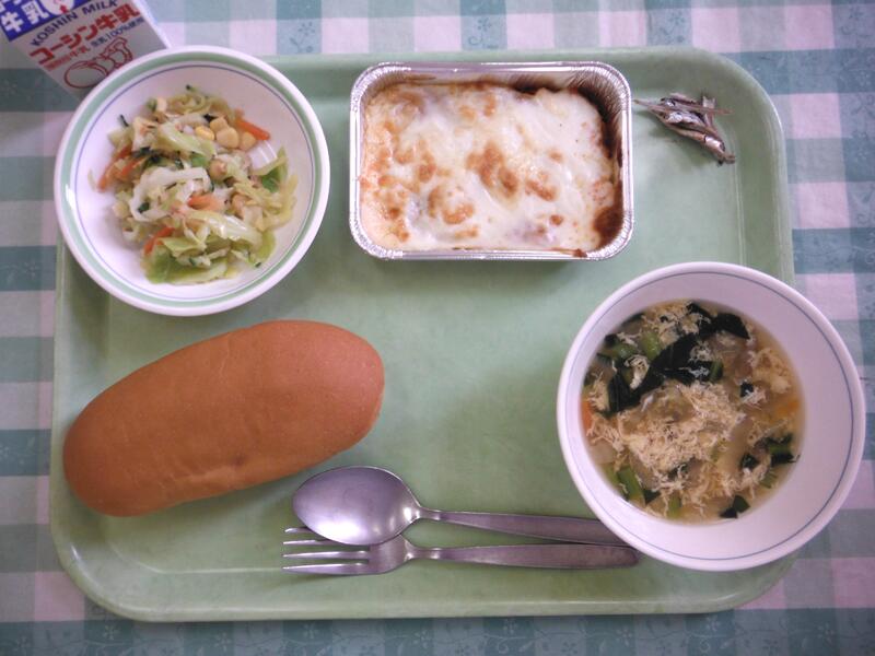 牛乳 コッペパン ラザニア風 ツナとひよこ豆のサラダ 卵と野菜のスープ 小魚