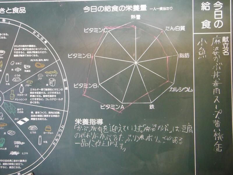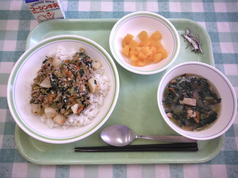 牛乳 麻婆かぶ丼 春雨スープ 黄桃缶 小魚