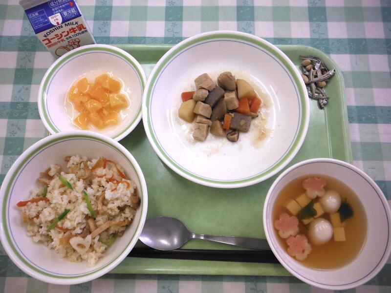 牛乳 五目ちらし 高野豆腐の田舎煮 うずら卵入りすまし汁 黄桃缶 大豆小魚