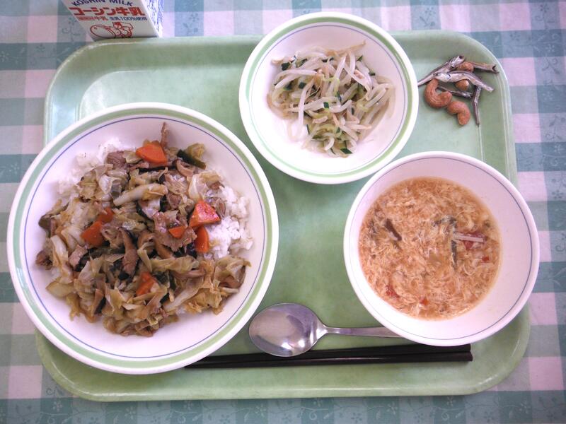 牛乳 ホイコーロー丼 もやしとハムのサラダ 卵入り酸辣湯(サンラータン) カシューナッツ小魚