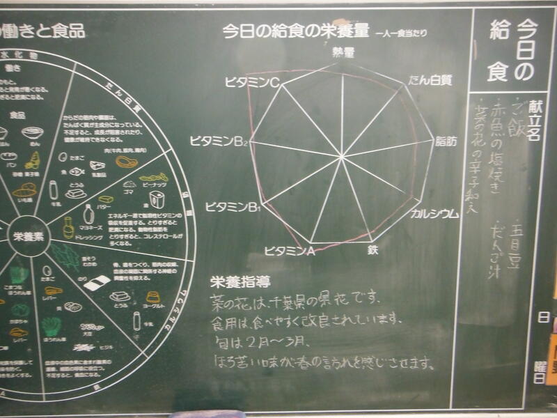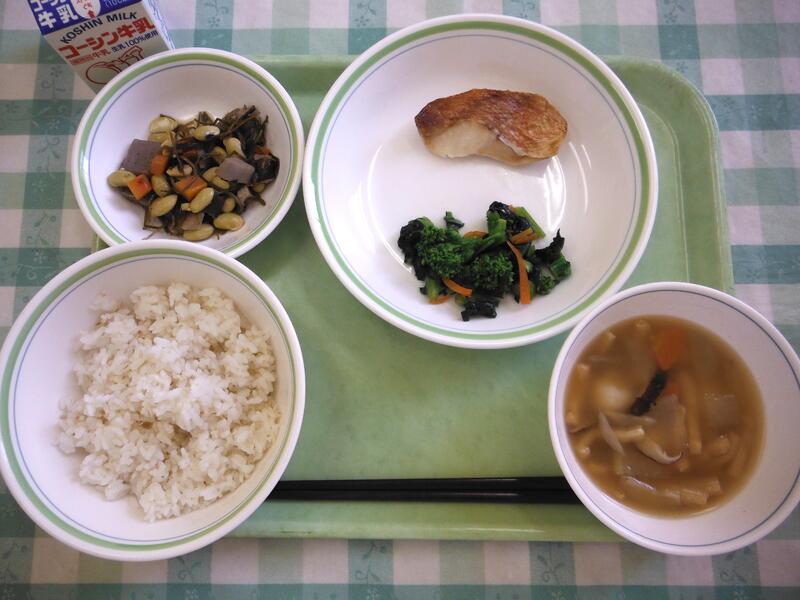 牛乳 ご飯 赤魚の塩焼き 菜の花の辛子和え 五目豆 だんご汁