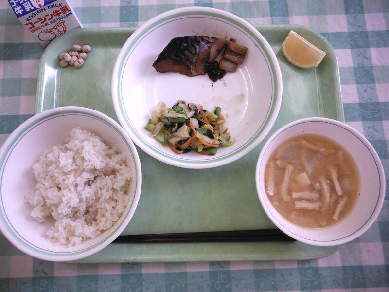 牛乳 ご飯 鯖のソース煮 おかか和え 大根の味噌汁 はるか いり大豆