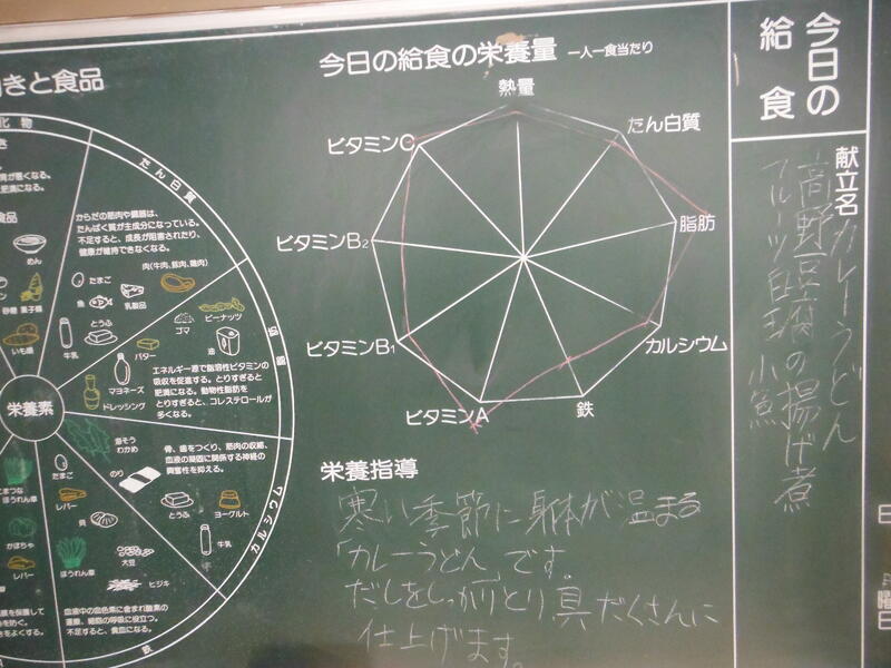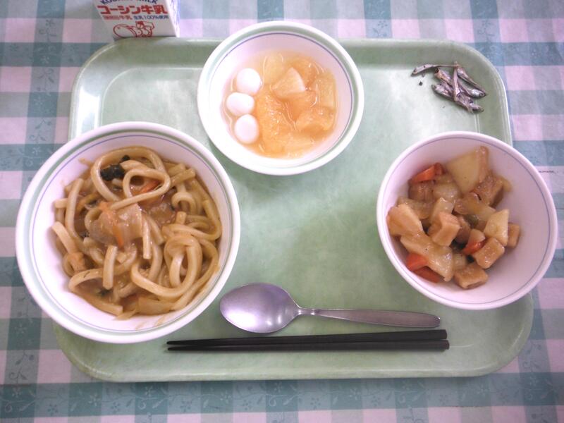 牛乳 カレーうどん 高野豆腐の揚げ煮 フルーツ白玉 小魚