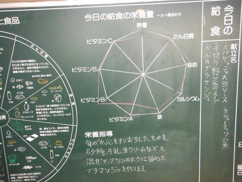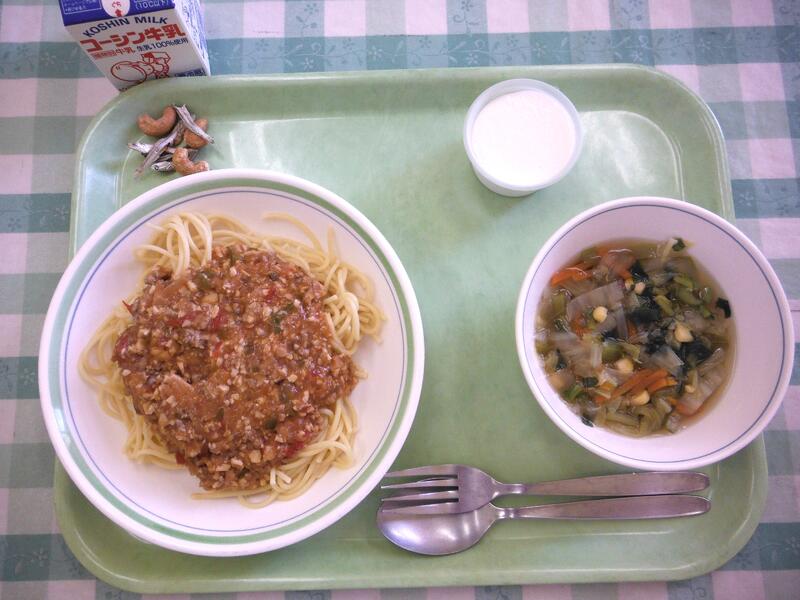 牛乳 スパゲティ大豆ソース 千切り野菜スープ かぶのブラマンジェ カシューナッツ小魚