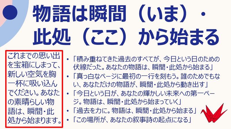 ・私も六十年以上生きてきて一番実感しているのは、「失敗を成功で上書きする」ことが人生の醍醐味だということです。少し大袈裟かもしれませんが、失敗を失敗のまま終わりにせず、それを小さな成功つなげていけば最終的に「私は失敗しません。なぜなら失敗をそのままにせずに次にいかすから」と堂々と人前で言い切ることができます。