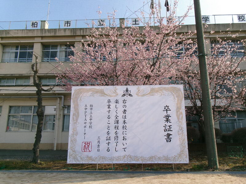 〇今年からPTAサポーターから寄贈していただいた撮影スポット用の横断幕を校庭に張り出しました。卒業式の記念撮影用として、巨大な卒業証書をモチーフにした横断幕が大人気でした。