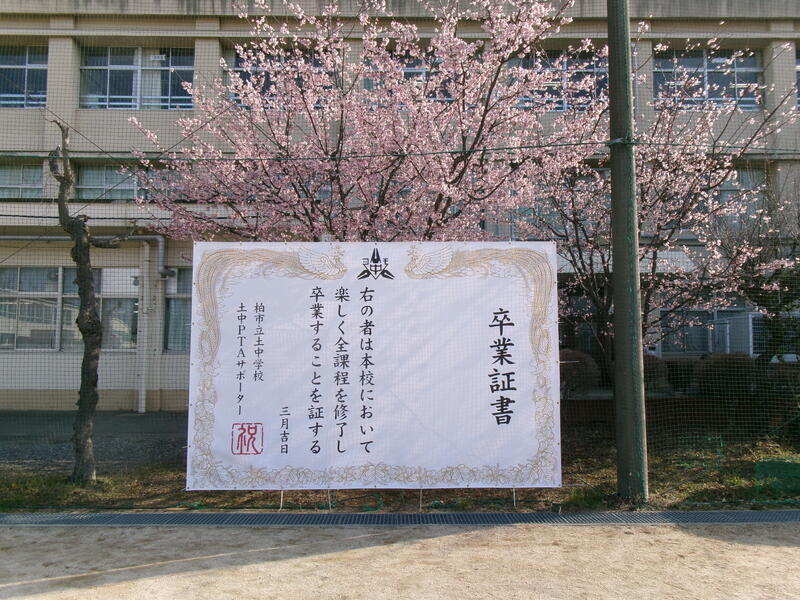 【PTAサポーター寄贈の新しいフォトスポット(卒業証書)と満開の桜】