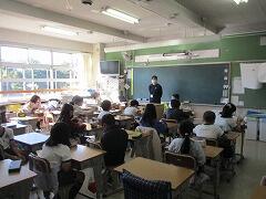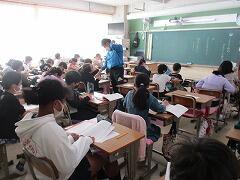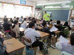 つくしの先生による事前指導は、3時間目に5年生、4時間目に6年生が体育館に集まって行いました。つくしの堀先生がお見えになりました。