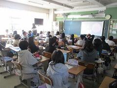 SNSに関わるトラブル防止について、家庭科室でPTA主催の講演会をお昼の時間に行いました。来校できない方々へのオンラインでの配信も行いました。